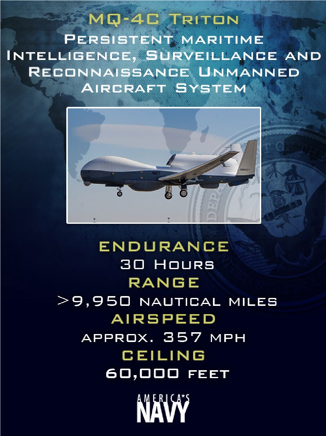 美国海军还装备着诺斯罗普·格鲁曼公司的超大型、远程、长航时MQ-4C海神(Triton)无人机(图6),用以在广阔的海洋和沿海地区执行实时ISR任务。2017年12月,美国海军订购了第七、第八和第九架Tritons,计划最终部署68架这种飞机。这些计划表明,美国海军计划将Triton作为其遂行全球水面舰艇和潜艇监视任务的关键性力量。