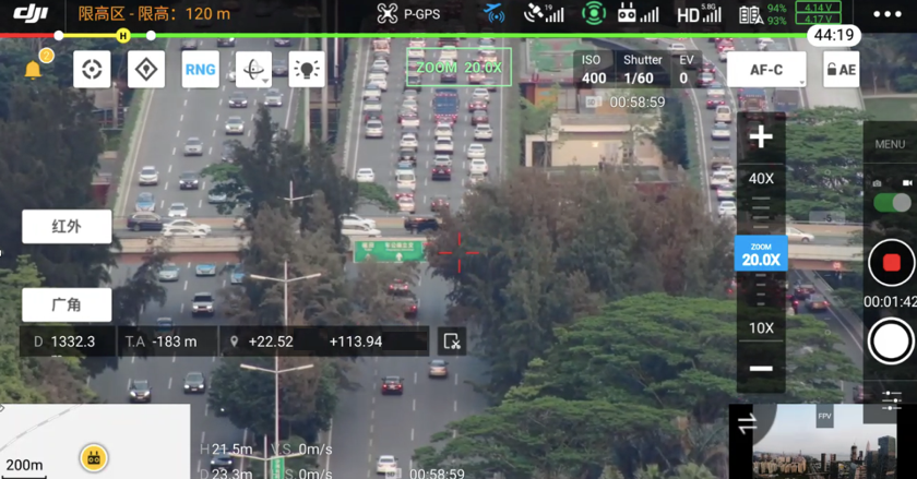 即使在夜间抓捕阶段,禅思 H20T 也可快速切换红外与夜景模式,让黑夜掩护下的嫌疑人位置信息暴露无遗。不仅如此,经纬 M300 RTK 的高级双控模式,可将高空侦查画面实时同步至一线抓捕行动中的警务人员,大大提升抓捕行动成功概率。