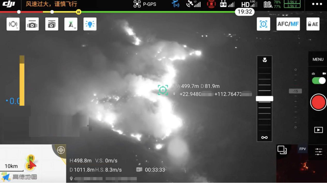 扑救过程中,地面团队往往受制于有限视野,难以准确判断火点位置,此时,经纬 M300 RTK 的打点定位功能,能够准确定位火点位置信息,并通过遥控器或大疆司空管理平台及时分享给指挥中心。将一系列火点位置信息组合,并连续监控,还可进一步对火线移动方位及趋势做进一步研判。