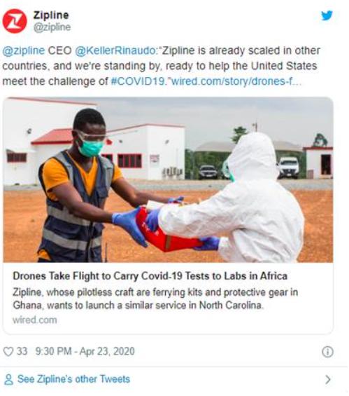 Zipline是正在调整服务项目以应对冠状病毒危机构成的挑战的多个美国公司之一。据媒体报道: