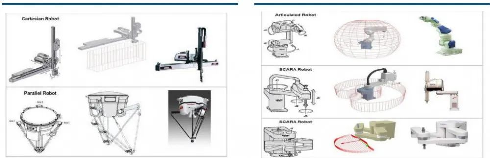 按照机械结构,工业机器人可分为直角坐标型、圆柱坐标型、球面坐标型、垂直多关节型、SCARA型(平面多关节机器人)及Delta型(并联关节机器人)