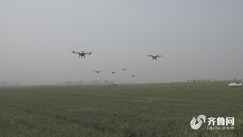 在临朐县东城街道七贤小麦万亩方片区,十多架旋翼植保无人机正在喷洒农药,工作人员站在地头即可完成遥控操作,且无人机喷洒药剂雾化程度高、覆盖面积大,用药更省、效率更高,其效率要比常规喷洒高出60倍。