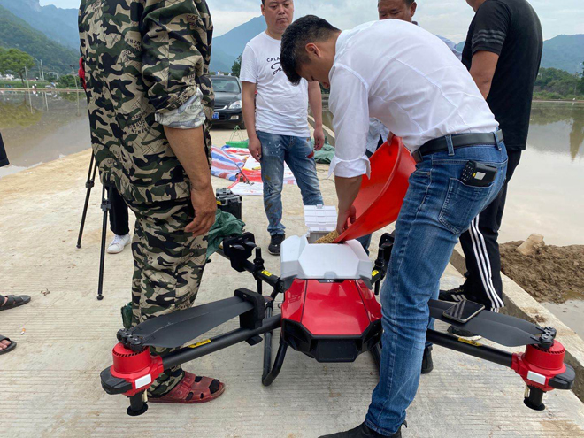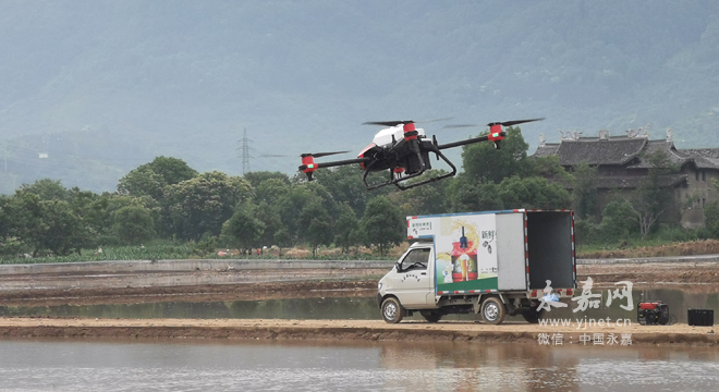 在岩头镇溪南村的农田里,记者看到一台无人机正在约2米的空中盘旋,播撒种子,现场有关人员告诉记者,这里其中有160亩农田要种上水稻,采用人工播撒的方式,每人每天最快只能播撒10亩,且播撒不均匀,而采用无人机播种速度快、质量高,节约种子量,节约人工成本,2小时内就能全部完成。