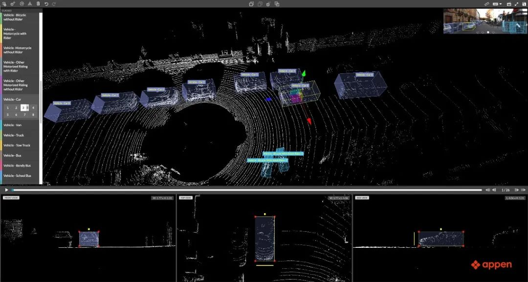 点云标记(LiDAR、雷达):通过识别和跟踪场景中的对象,了解汽车前后和周围的场景。将点云数据和视频流合并到一个要标注的场景中。点云数据可帮助您的模型了解汽车周围的情况。