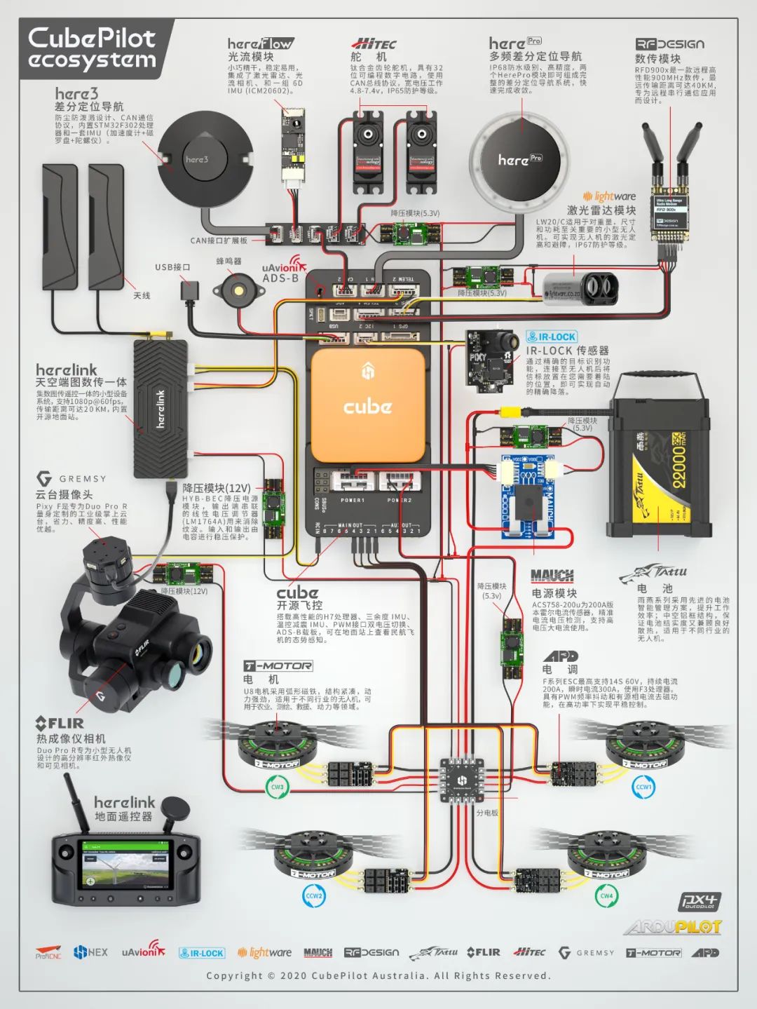 这张开源飞控硬件接线图展示了The Cube飞控和行业应用中常用的重要硬件(包括电机、电池和数传等),并阐述了每一个部件的具体功能。为了方便用户的应用,图中详细描述了每一个部件之间的真实硬件连接关系。