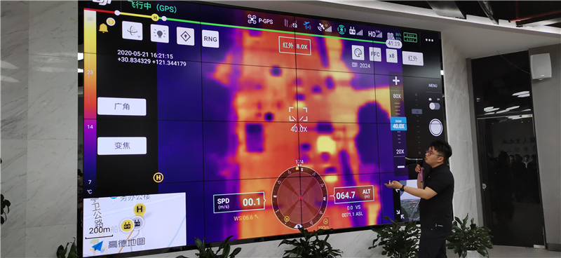 在推介会结束前,主办方上海到摄与大疆工程师在基地做了现场展示,通过电子大屏演示了无人机飞行及最新挂载的应用。智能跟踪功能是经纬 M300 RTK 与禅思 H20系列组合下的一大重要亮点,在面对人、车等移动目标时,无人机可实现自主识别、定位并持续跟踪,借助强大的变焦功能,将目标始终锁定在画面中心。因此,即使面对近1000米外的高速移动车辆,也能够看清车牌。这在野外追捕、交通执法等公共安全应用场景中,能够帮助警务人员高效完成追踪和执法记录,提升警务效率。