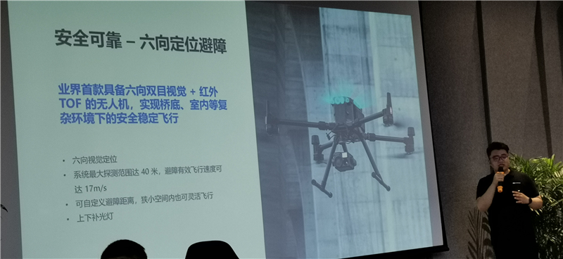 据大疆产品经理介绍,大疆创新本次发布的经纬 M300 RTK主要特色在于智能飞行平台与混合传感器负载强强联合,组成前所未有的空中解决方案,与上一代相比,它有15KM的图传距离,55分钟最长飞行时间,可广泛用于警用消防、应急救援、执法巡检等等领域。经纬M300 RTK性能强劲、安全可靠、智能先进、灵活开放,搭配上禅思 Zenmuse H20 系列负载将重新树立工业级无人机系统的新标杆。
