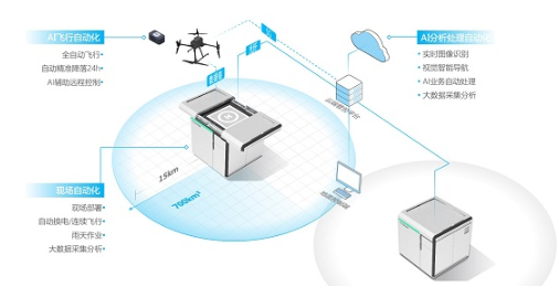 在城市应急突发事件上,工作人员远程下达任务指令,距离最近的自动机场自动放飞无人机,快速飞抵事件现场,第一时间了解现场情况,视频取证后通过喊话系统及时劝阻纠正。