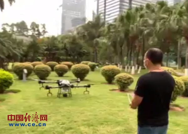 图为大疆创新科技有限公司商务拓展和政府事务总监王轩在“中巴经贸热线云沙龙-联手治蝗”跨国直播活动中分享的无人机喷洒农药视频。