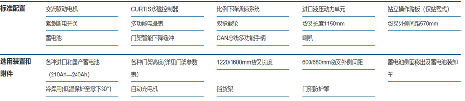 | 品牌 | 型号 | 类型 | 配电池 | 载重 | 举升高度 | 荷载中心距 | 满载/空载最大速度 | 电池容量 |