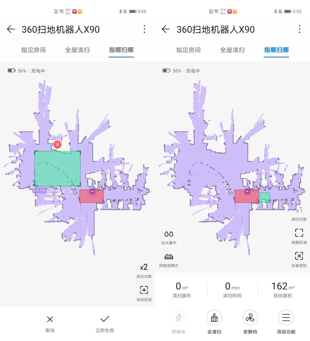 家中地图建立完毕之后,我们可在App中将全屋分为多个区域。当只想打扫房间的时候,就可以指定房间区域让其清扫。像客厅这种比较难清扫的,可以指定清扫客厅区域之后,再选择清扫次数进行深度清扫。还可以指定顺序进行清扫,比如先清扫主卧、再清扫次卧,最后再清扫大厅。