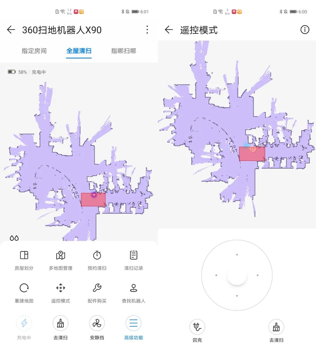 如果中途清扫电量不够,会自动回到充电桩进行充电,充完店之后会自动进行上次没有清扫完成的任务。另外,在App众多功能之中,最令猪编感到意外的就是它的遥控功能。可以随意控制360扫地机器人的清扫方向和位置,相当于遥控车一般。