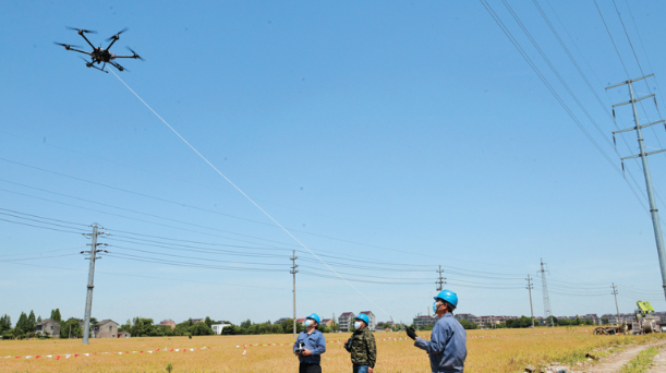 近日,在钟埭园区110千伏变电站进线优化工程的施工现场,一架无人机拖拽着导引绳进行空中架线作业。市供电公司今年首次运用无人机完成空中架线作业,不仅降低了电力线路铺设工程作业时的经济成本,工作效率也至少提高了5倍。