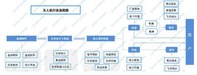 2020年新冠疫情突然来袭,无人机成战“疫”利器。无人机在医院和疾控中心间穿梭,实施疫情防控急救药品和标本的自动化转运;无人机在公路上盘旋,代替人工进行空中指挥的工作;“庄稼卫士”变身“消防能手”,无人机成为全国各地广大农村乃至城区防疫消杀工作的“超级神器”;隔空中喊话宣传劝导,无人机成为宣传小能手。无人机行业产业链大致可分为研发、生产、销售、服务等细分领域,具体可分为产品研发试验、飞控系统开发、发动机等关键零部件生产、载荷制造、无人机整机组装、无人机销售、无人机作业培训、运营服务业务、一体化应用服务环节。