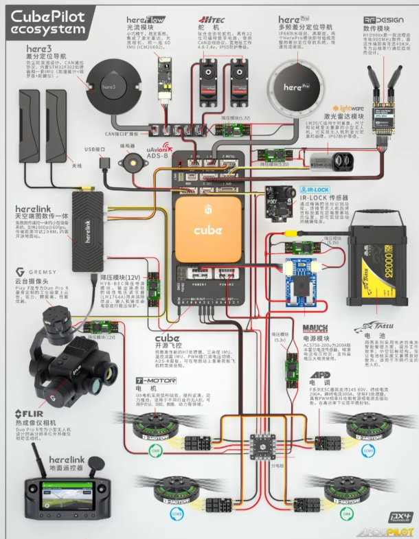 这张开源飞控硬件接线图展示了The Cube飞控和行业应用中常用的重要硬件(包括电机、电池和数传等),并阐述了每一个部件的具体功能。为了方便用户的应用,图中详细描述了每一个部件之间的真实硬件连接关系。