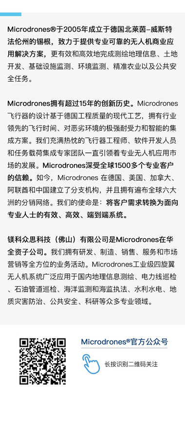 2020年5月25日,Microdrones-(镁科众思) 宣布在中国推出 mdaaS - Microdrones 即服务(Microdrones as a Service),面向广泛的测绘地理信息专业人员提供其测绘设备和解决方案。mdaaS 引入无人机测绘解决方案,包括正确使用无人机 LiDAR 进行测量所需的一切元素,以及各种便捷的软硬件套装和按月支付费用的选项。