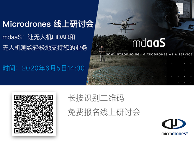 6月5日,Microdrones 将推出针对该创新方案的网络研讨会:“mdaaS:让无人机 LiDAR 和无人机测绘轻松地支持您的业务”。网络研讨会将帮助客户了解计划所提供的选项,以配置适合他们的方案。如需注册,敬请识别下图二维码。