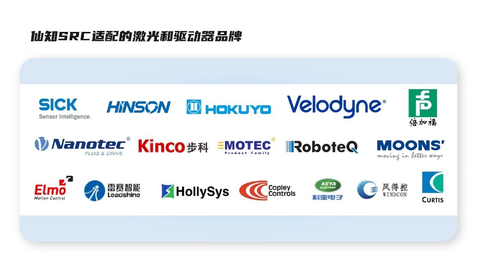 激光SLAM移动机器人的核心零部件,除了最核心的控制器以外,还有激光、舵轮、驱动器、电机、各种传感器等等,而控制器的适配能力至关重要。相比科尔摩根NDC8 AGV控制系统,仙知SRC-2000(S)系列核心控制器做到了全方位的适配。