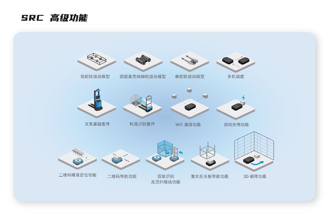 仙知SRC-2000(S)系列核心控制器除了提供地图构建、定位模块、导航模块、API接口等基本功能外,还提供非常丰富的高级功能,比如自动叉车功能套件、顶升机器人随动功能、3D避障功能、辊筒/潜伏/顶升等各类AGV扩展功能等,只需要获取相应软件授权即可实现各种高功能的动态选配。