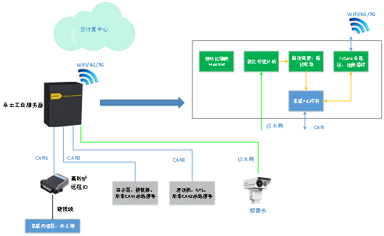 (6) 工业服务器内置的WIFI/4G/5G模块,结合软网关应用,可实现工程车辆远程维护、控制,以及云端多车协同控制。