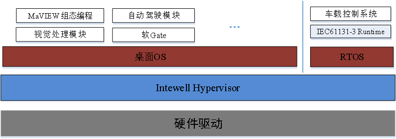 (4) 利用工业服务器预装的Intewell操作系统高实时虚拟化特性,利用软件定义一个实时系统(PLC)用于工程机械的控制,定义一个桌面系统用于集成自动驾驶算法以及视觉处理。如下图;