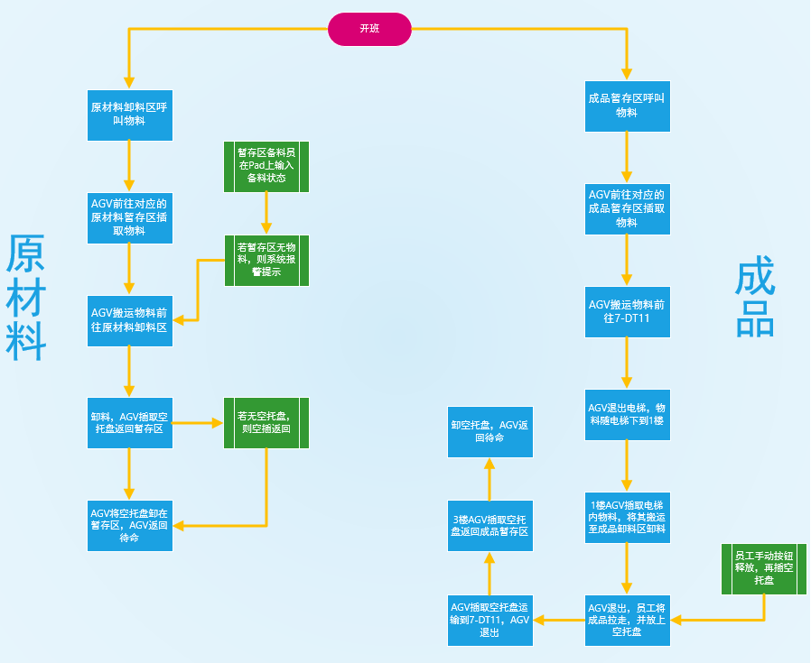 该医药企业导入2台AGV后,原有白夜班共10人,现留下2人备料员、维护人员,节省12人力成本。实现了业务流程: