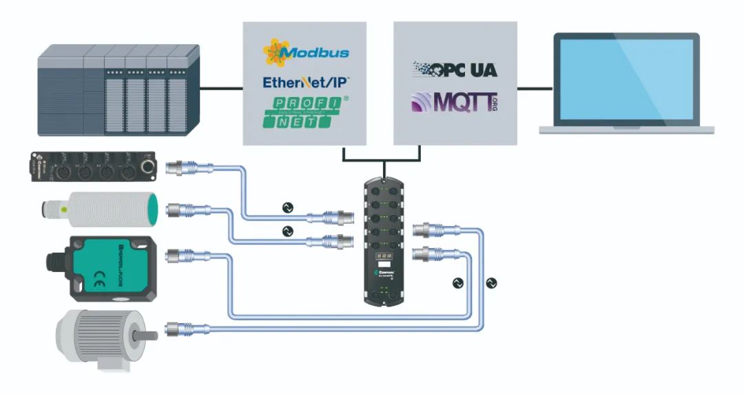 倍加福 ICE2/3系列IO-Link主站模块,不仅可以向PLC平台传输传感器的过程数据,同时还可以通过 Modbus TCP或OPC UA 的方式,将传感器的服务数据和过程数据,发送至 IIoT / 工业4.0数据云端或 SCADA 系统。