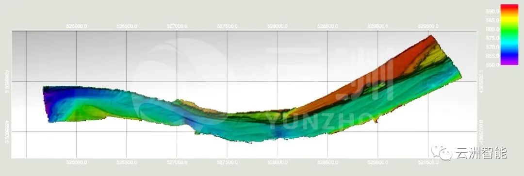 无人船搭载多波束系统进行水下地形测量,根据实测水深值调整测线间距,以保证水下全覆盖测量。在水深较浅区域,设置补测测线补充测量以满足全覆盖测量要求。本次测量数据生成了20cm格网3D图,如下所示: