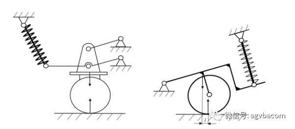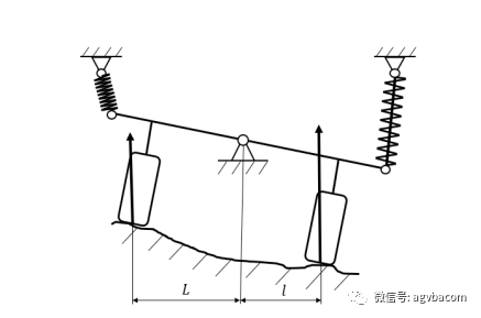 (4)摆动桥式。摆动桥式结构通过整桥式将两个轮子连接起来,以桥的中心作为摆动中心与车体铰接。摆动桥式的路面适应结构常见于装载机以及相关的工程机械中,通过释放整桥的旋转自由度来适应地面的不平整。弹簧在该结构中主要起到了减缓冲击的作用,在实际的应用中,若路面仅仅只是不平整而没有给驱动单元带来更多的冲击,摆动桥式的浮动结构可以无须设置弹簧。地形的不平整使得两轮的支承力离摆动中心的距离不一样,则力臂较远的轮子支承力小,力臂较短的轮子支承力大,浮动结构由此来适应路面的不平。
