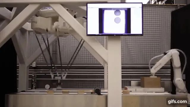 与上边讲述的自动装箱机器人类似,有些码垛要操作的物料单元可能是被随机摆放在一个工位上,同样的,标准机械手是无法直接抓取物料的,需要一个外接的识别系统告知机械手,要抓取的物料究竟在什么位置,这里也需要视觉识别技术。