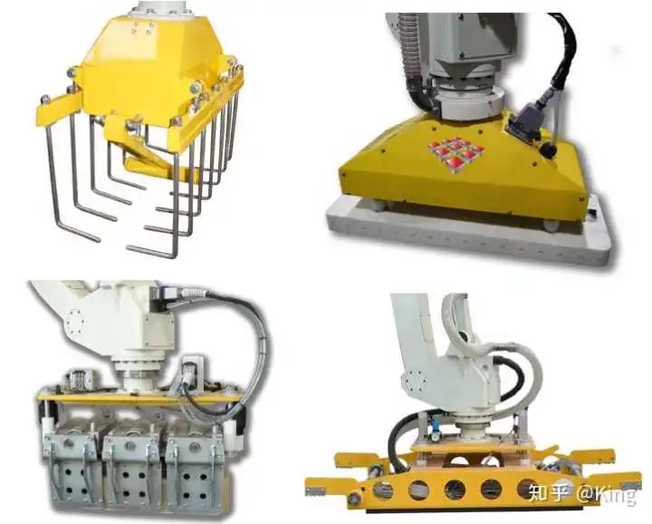 而在实际中更多的应用中,只有普通的六轴机器人要处理不同的工作,那可以采取自动换家具的方式。比如机器人要自己拿一个料箱,要自己抓取物品到料箱里,要自己将料箱码到托盘上,码号的托盘要被这个机械手摞到另外一个托盘上。这种工况下可以就可以采用一体机器人换家具的方式,家具可以被设计在一个复杂的多功能的家具上,也可以将家具单独设计放置在固定的家具待换工位上。