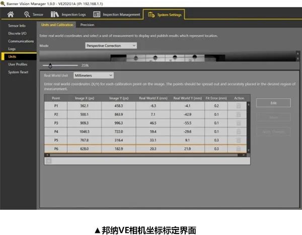 以下是VE相机的坐标系标定界面,VE相机支持最多20个点的手动标定,在标定平面上选取对应参考点,逐一控制机器人的工具抓手移动到对应点,将机器人坐标点填入以下的软件界面表格,然后点击“apply changes”即可。