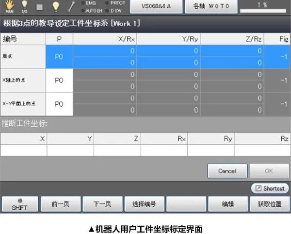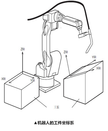 用户工件坐标的标定一般通过3个示教点来实现,第一个示教点是用户工件坐标系的原点;第二个示教点在X轴上,第一个示教点到第二个示教点的连线是X轴,方向为X正方向;第三个示教点在Y轴的正方向区域内。Z轴由右手手法则确定。