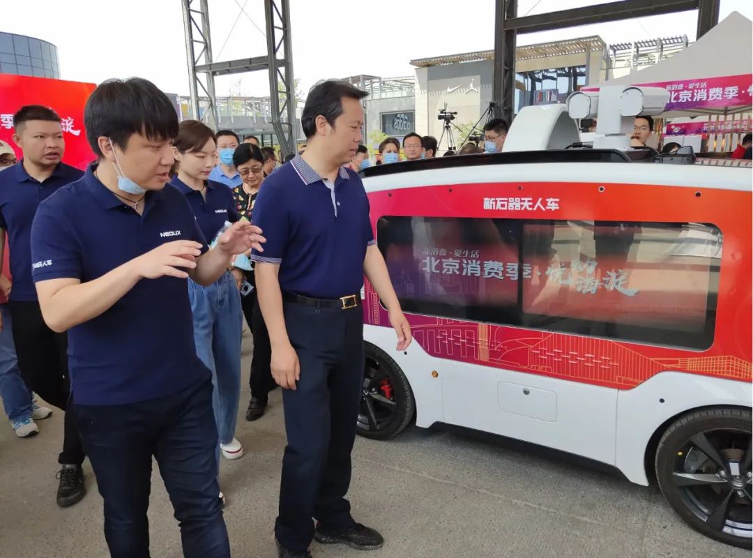 (新石器创始人/CEO余恩源,向北京市委书记蔡奇、海淀区区委书记于军介绍新石器无人车)