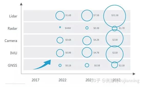 在环境感知领域,凭借较多技术路线与庞大的市场规模,激光雷达和毫米波雷达在过去几年间一直是国内创业公司相对集中的两个领域。甚至吸引了大疆、华为等巨头的加入。发展至今,禾赛科技、速腾聚创等公司已推出性价比较高的产品,并产生稳定营收。即便玩家众多,但环境感知领域广阔的市场前景仍将吸引更多新企业加入。据法国行业研究公司Yole测算,未来数年,传感器收入规模将进入高速发展期。其中,激光雷达、IMU、摄像头排名前三。