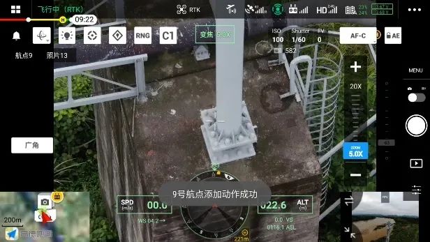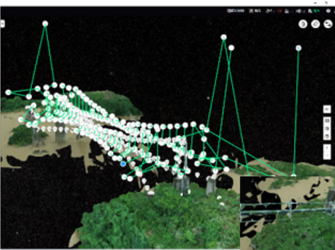 采用精灵 4 RTK 采集影像重建所得的高精度三维模型,具备绝对位置坐标。逐一标注巡检目标,大疆智图软件能够反算对应的无人机航点坐标、云台俯仰角、相机变焦倍率,并且可以预览巡检效果,最终自动生成巡检飞行任务。实验室针对柳州悬索跨特点,设计了 190 个巡检位,覆盖了所有无人机可巡检的悬索跨目标。