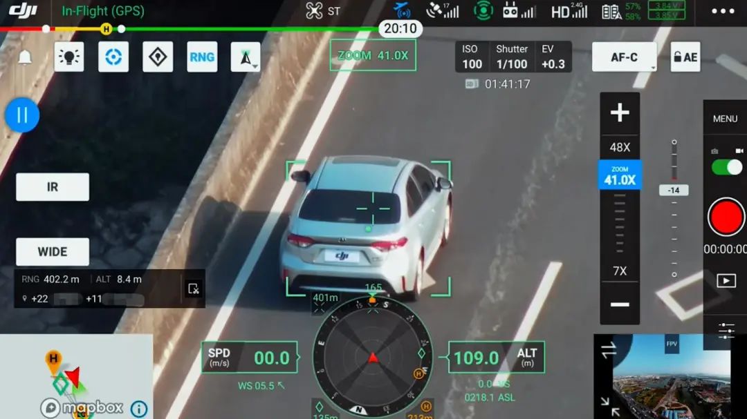 2019年,大疆行业应用启动了智能跟踪功能的项目研发,并邀请莆田警方作为“外脑”参与。最终集成在经纬 M300 RTK上的智能跟踪功能,可实现对行驶车辆的持续跟踪,即便在距离600米外也能看清车牌,并实时获取目标位置信息,分享给指挥中心。