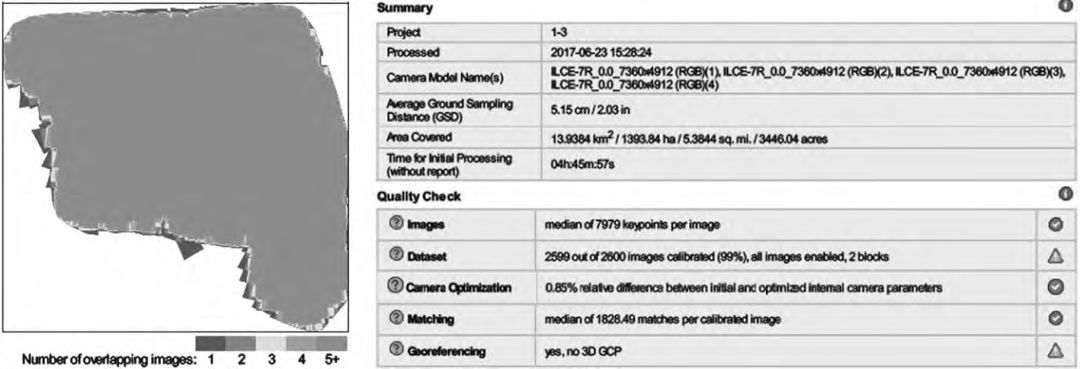 现场对航飞数据进行整理,核查拍摄照片数量与飞行轨迹参数是否一致,是否出现漏拍现象; 检查照片质量,是否有模糊不清等情况; 现场对航飞成果质量的进行全面、快速检查、计算航向重叠度、旁向重叠度、生成检查结果报表等。检查完成后如存在质量问题则需重新补摄飞行,若无质量问题,则本次航摄完成,如图6 所示。