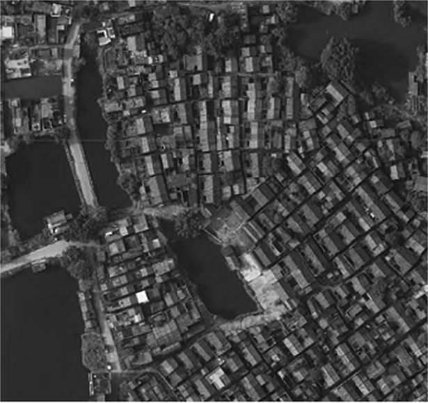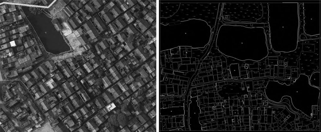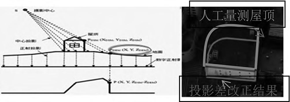 本项目通过前期的研究成果,采用一种联合影像方位元素和物方三维点云数据的方法,利用投影中心、DSM、DEM 上形成的同名点共线关系,由DSM 物方点利用外方位元素计算出的DEM 像方点之间的高差所构造出的数字高程模型,形成跟随影像点位同步变化的投影高差模型,此处称它为影像同步变化的投影数字差模型( image elevation synchronous model, IESM) ,通过该模型采用共线方程解算房屋屋角的三维坐标,从而实现了建筑物的半自动投影差改正。由于测区建筑主要以低层居民房为主,利用投影差改正模型取得良好效果,如图10 所示。