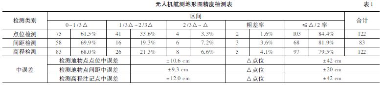 基于无人机航摄数据,经上述流程化的处理,得到测区DOM、DEM、DLG 等,为了保证成果精度,对本次航摄测绘的地形图成果精度进行外业检测,采用GZCORS_RTK 快速获取外业检查点的三维坐标数据,整个测区内施测平面坐标及高程检测点122 个、距离检测点83个,利用中误差计算公式计算出各个检查点的中误差,依据计算结果可得( 如表1 所示) ,本次航摄绘制的1 ∶ 500地形图精度满足《低空数字航空摄影测量内业规范》的精度要求。可作为基础测绘成果提供使用。