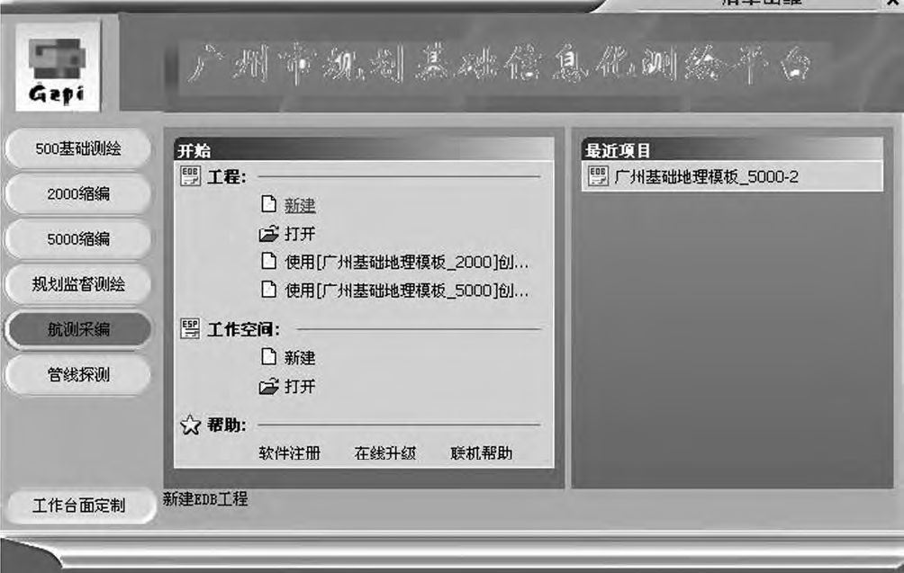 ( 2) 新建工程,打开EPS 基础测绘平台,选择航测采编模块,建立广州市基础地理模板-500 工程文件。
