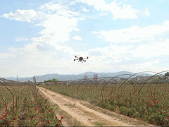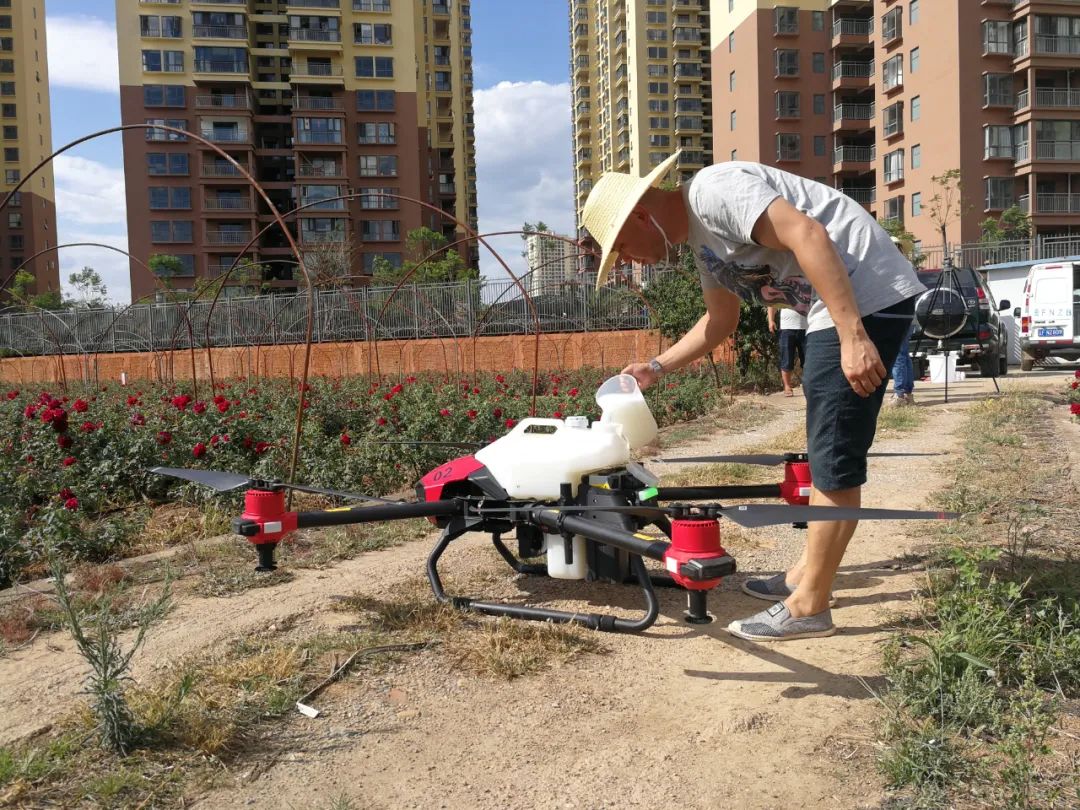 沿着预设轨道在玫瑰花田上空喷洒农药