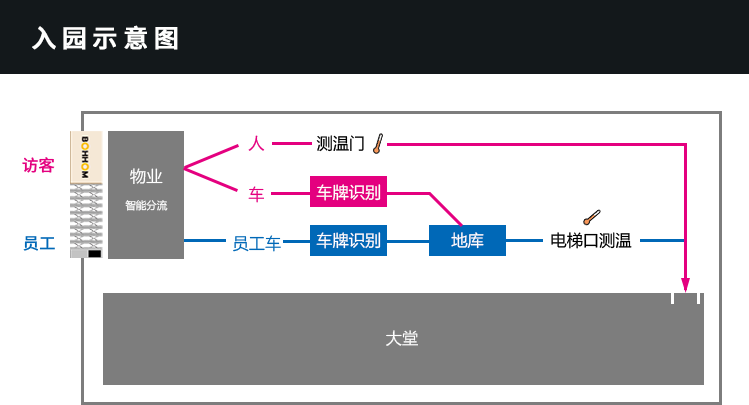 车辆则通过车牌识别,进入地库指定区域,人员下车后在地库电梯口进行人脸识别并测温;