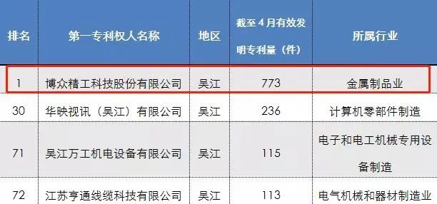近日,江苏制造业企业百强榜揭晓,其中博众精工以有效发明专利773件的数量位列该榜单第一。