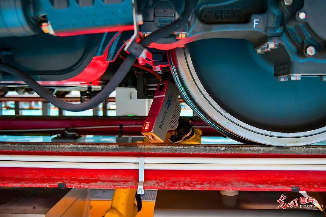 图:车底智能巡检机器人正在为京张高铁动车组"把脉体检"
