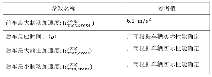 从上述公式中可以看到,最小安全纵向距离取决于以下参数:前车最大制动加速度和后车的相关性能参数,后者可以由车辆厂商根据车辆的实际性能决定,但是前车的最大制动加速度如何预测?如果行业内没有一个可以参考的值,后车就无法设定与前车的合理安全距离。显然如果该值越大,后车需要预留的跟车距离就越长,道路的通行能力就越受限,因此行业需要制定出一个参考值,既能保证道路的通行能力,又能兼顾车辆的物理实现能力。