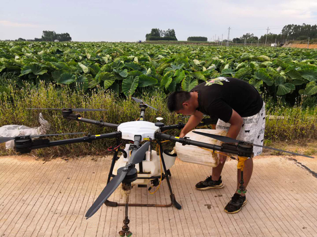 芋头田间,在飞手的操控下,一架六旋翼天鹰兄弟植保无人机X25正在距离芋头上方进行平稳飞行,喷洒药液穿透性强,均匀渗透作物的底部。据现场负责人表示,芋头叶面大,人工喷洒效率低,还会出现重喷漏喷现象,而利用植保无人机节省时间,提高效率,操作人员只要通过地面操作就可实现喷洒药剂、种子、粉剂等。防止人体近距离接触农药而中毒,特别是高温季节,保证人体安全。