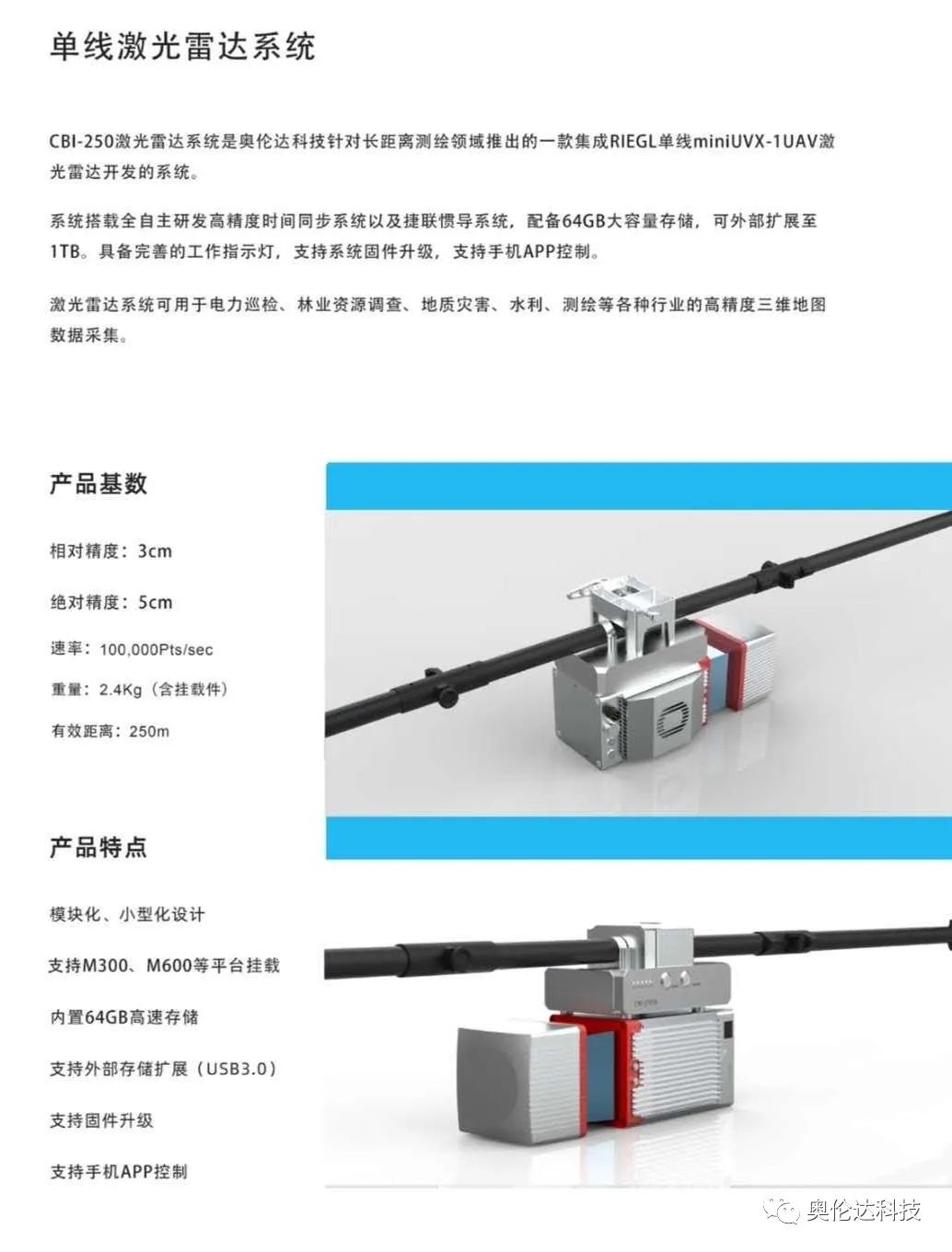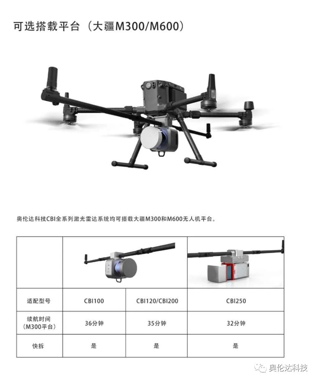 同时,CBI-250单线激光雷达系统,成为行业内唯一一款可以挂载M300无人机的长测程激光雷达。