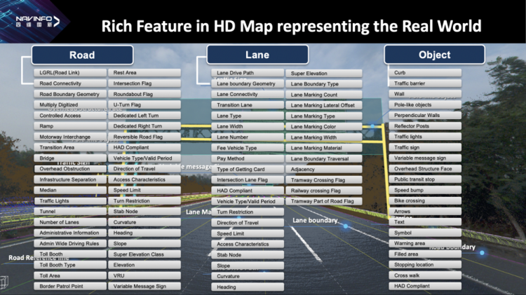 在传统地图中,道路经常被抽象成宽度无差别的线,然而高精度地图不仅要有准确的定位坐标,还需要采集包括车道边界、交通标牌、护栏、路灯杆、龙门架在内的 100 多种路面属性要素,甚至每一条路路边马路牙的材质和宽窄,都要精确记录在地图中。当无人车上路时,高精度地图的每一个属性都关乎自动驾驶的安全:哪些路段周边有防护栏,哪些障碍物的材质偏软安全系数较高,都是行驶中做出判断的重要依据。