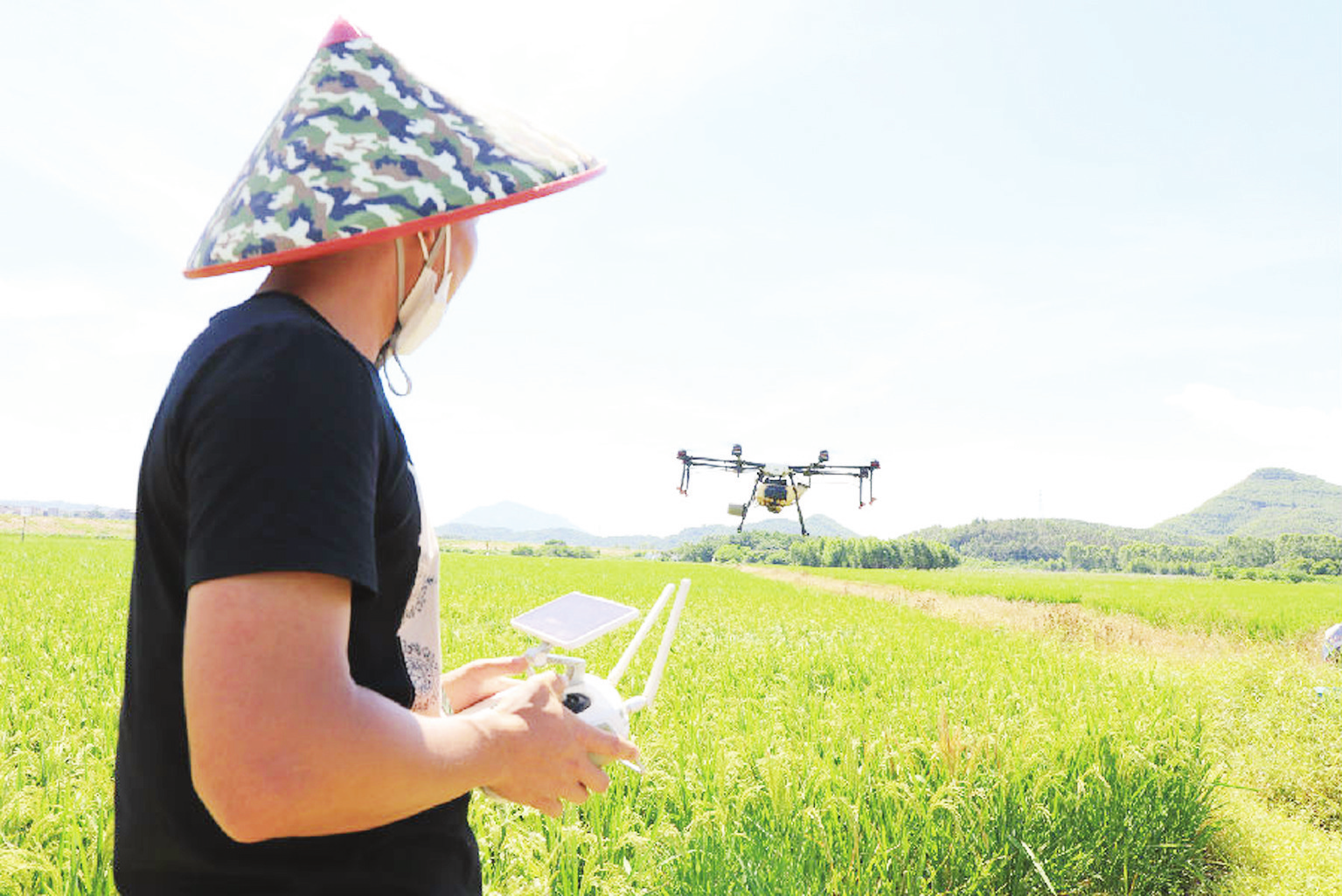 庄稼茂盛、树木葳蕤、芳草碧绿……近日,在漳浦县绥安镇溪南村的田野上,只见一片片绿油油的稻田在风中摇摇晃晃,起伏不定,形成了“麦浪”,与蓝天、白云、远山形成一道漂亮的风景线。在田埂上,一个农技人员戴着草帽,手里拿着遥控器,远远地遥控一架农用无人机在稻田上空折返往来,一边飞行,一边喷洒农药。这罕见的画面令来往的农民忍不住驻足行“注目礼”。